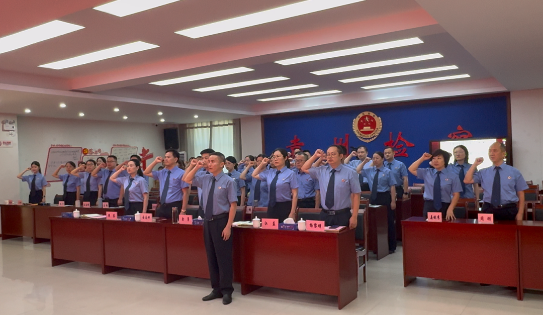 活动伊始,院党组副书记、副检察长陈蔚国同志带领全体党员干警重温入党誓词,大家面对鲜红党旗,右手握拳,一字一句许下铮铮誓言。